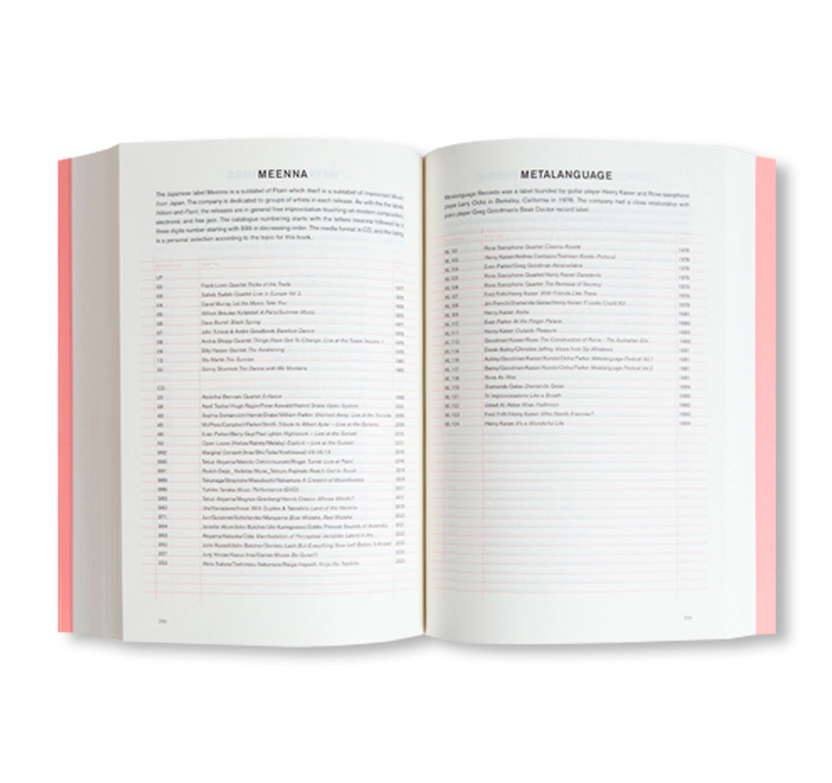 ノルウェー人美術史家であり音楽研究者のヨハネス・ルー(Johannes Rød)の作品集。本書は作者が著した同必携ガイドの大幅増補版であり、創造的音楽の記録史を60年にわたって横断する、ディスコグラフィ研究の記念碑である。本文381ページに加え、レーベルのアートワークにまつわるノンブルなしの47ページが付随する。185のレーベルについて執拗なまでにディテールを追求し、確かな眼差しでマッピング。1960年代半ばにESP-Disk(ニューヨーク)、BYG/Actuel(パリ)などが切り開いたフリー・ジャズの勃興から、FMP(ベルリン)、Incus(ロンドン)、ICP(アムステルダム)、Po Torch(アーヘン)が記したヨーロッパ即興運動の軌跡、さらにClean Feed(リスボン)、Trost Records(ウィーン)、Astral Spirits(オースティン)、Smalltown Supersound(オスロ)といった現在の動向までを視野に入れる。